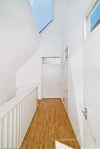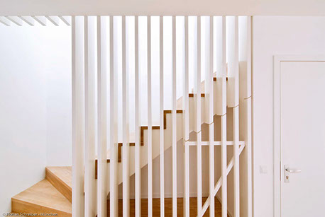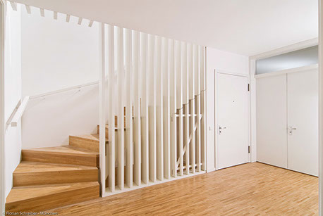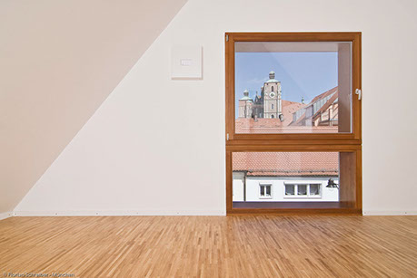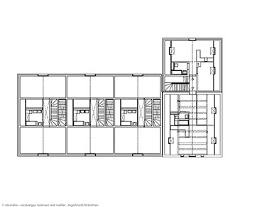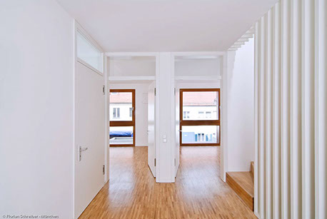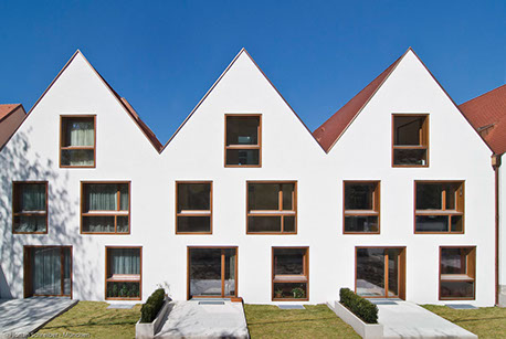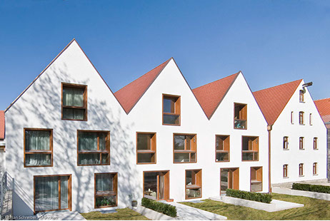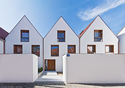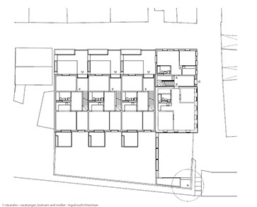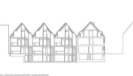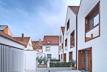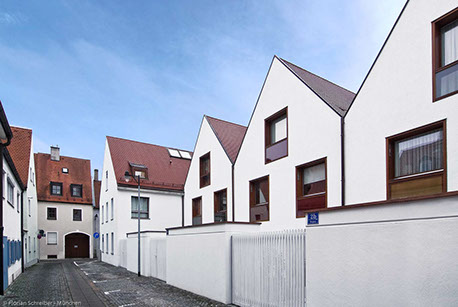 Durch die Aufteilung des Programms auf fünf Häuser entsteht ein neuer Typus, der eine Mischung aus Geschosswohnungsbau und Reihenhaus darstellt und die richtige Antwort auf die Struktur der mittelalterlichen Altstadt Ingolstadts findet. So entstanden vier Hauseingänge bzw. Adressen mit jeweils zugeordneten Freiflächen.