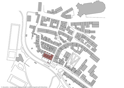 Das Grundstück liegt im Ensembleschutz der Ingolstädter Altstadt, deren Struktur und Formenkanon zu Kontext und Vorbild der neuen Bebauung wurden. An städtebaulich prominenter Stelle entlang der ehemaligen Stadtbefestigung entsteht ein gleichsam dominantes wie integratives Ensemble aus vier neuen Wohnhäusern, die den denkmalgeschützten Bestand einbinden. Die aneinander gereihten Giebelhäuser wirken identitätsstiftend, den Bewohnern soll das Gefühl vom „eigenen Haus“ vermittelt werden. Der Rücksprung der Gebäudeflucht zur Neugasse im Norden ermöglicht die Einrichtung von privaten Höfen, während sich die Freifläche im Süden in Mietergärten gliedert, die den erdgeschoßigen Wohnungen vorgelagert sind. Das Motiv vorgelagerter Höfe und Gärten ist der „Schleifmühle“ entlehnt, der ältesten erhaltenen Wohnzeile der Ingolstädter Altstadt, die in unmittelbarer Nähe liegt.