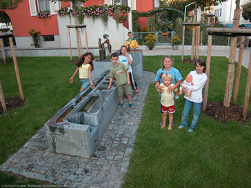 Das Wasser läuft aus dem Wasserspender zuerst in das höchste Becken, von dort läuft es in das Figurenbecken, umrundet die Figuren und gelangt von da in das lange Becken auf eine Wasserscheide, die das Wasser links oder rechts auf verschiedenen Wegen zum Abfluss gelangen lässt. Gerade im unteren Becken ist ein spielerischer Umgang möglich, durch Verstöpseln oder Zuhalten der einzelnen beckenverbindenden Löcher lassen sich Umleitungen, Überflutungen und erhöhte Wasserkraft für das Wasserrad spielerisch herstellen.