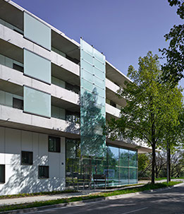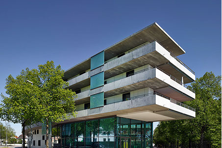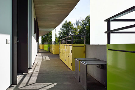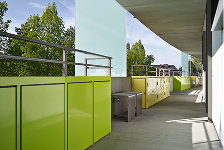 Die drei Treppenhäuser gleichen den Geländeversatz von 1,20m aus und erschließen das Gebäude wirtschaftlich und barrierefrei. Unter dem Kopf der Schwinge ist außerdem ein Fahrradweg parallel zur Donau in Richtung Stadtmitte angeschlossen.