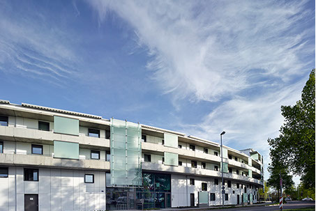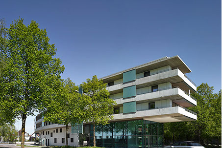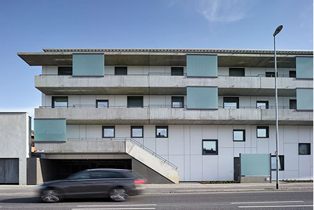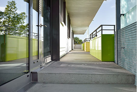 Runde Laubengang-Stahlbetonfertigteile bilden die Kurve und beschreiben die runde straßenbegleitende Laubengangvorderkante. Die geschlossene VHF-Fassade folgt dem Kreis als Vieleck, wobei jeder Abschnitt von drei Achsen eine Schuppe mit integrierter Beleuchtung ausbildet. Fenster- und Türöffnungen durchstoßen und zonieren die Fassadenebene.