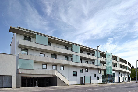 Der Überhang ist das Tor zum grünen Innenhof und macht die rückgebaute Gerhard-Hauptmann-Str. privater, die Wohnanlage ruhiger.