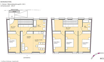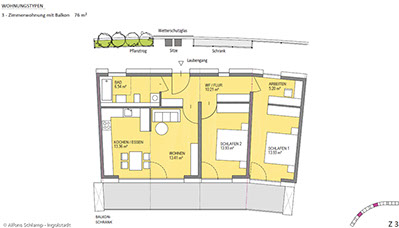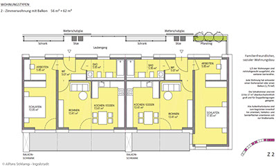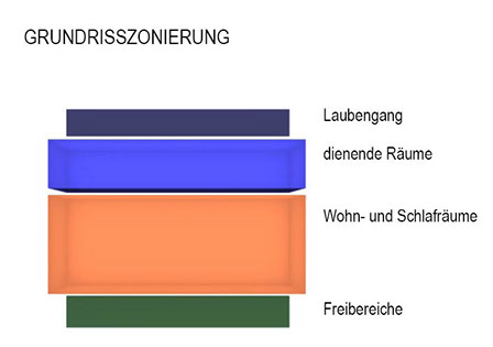 Alle Aufenthaltsräume sind dabei zum ruhigen, grünen Innenhof orientiert und von „laut nach leise“ zoniert. Jede Wohnung hat einen sehr großzügigen Freibereich (Garten oder Loggia). Alle Wohnungen sind barrierefrei nach 18040 Teil 2, wobei 30% der Wohnungen behindertengerecht nach Teil 1 ausgeführt sind. Die Schlafräume sind mit mind. 15m² über dem Standard im sozialen Wohnungsbau und somit flexibel belegbar. Zusätzliche Arbeits- und Spielbereiche in den Puffer-Flurzonen bieten zusätzliche Aufenthaltsmöglichkeiten.