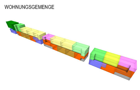 Es wurden zwei grundsätzliche Wohnungsmodelle entwickelt, die den Anforderungen entsprechend kombiniert wurden: