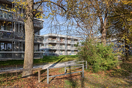 Die drei Punkthäuser liegen auf Garteninseln im grünen Wohnhof, der sich mit der angrenzenden Parkanlage und der Flussaue verbindet. Der Landschaftsraum der Donauniederungen fließt bis zur straßenbegrenzenden Bebauung. Die Inseln sind zum Gebäude hin angehoben, wodurch sich der private Bereich vom halböffentlichen absetzt und der Freiraum zoniert wird. Es entstehen Aufenthaltsbereiche, Platzsituationen, Sitzecken und Spielplätze, Orte um zu beobachten und um sich zurückzuziehen.