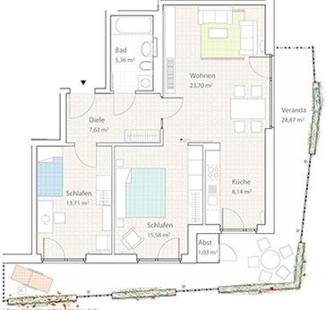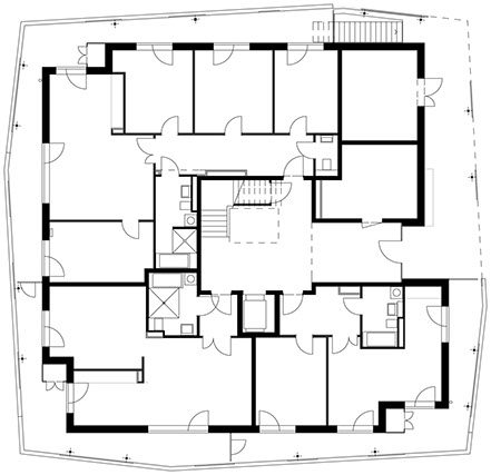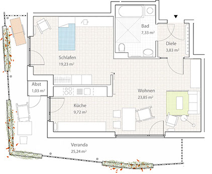 Jede Wohnung besetzt eine Gebäudeecke des Solitärs und ist so in zwei Himmelsrichtungen ausgerichtet. Über Eingangsdielen, die zusammen mit den Bädern eine Schicht um das Treppenhaus bilden, gelangt man in die Wohnräume. Allen vorgelagert ist eine umlaufende Veranda, die einen privaten Außenraum und eine schützende Zwischenzone bildet. Sie legt sich um die Zimmer, weitet und verengt sich und bietet mal mehreren Personen Platz , mal wird sie zum Rückzugsort für den Einzelnen. Gleichzeitig ist sie ein wohnungsinterner Weg im Freien mit Ausblicken in die Landschaft.
